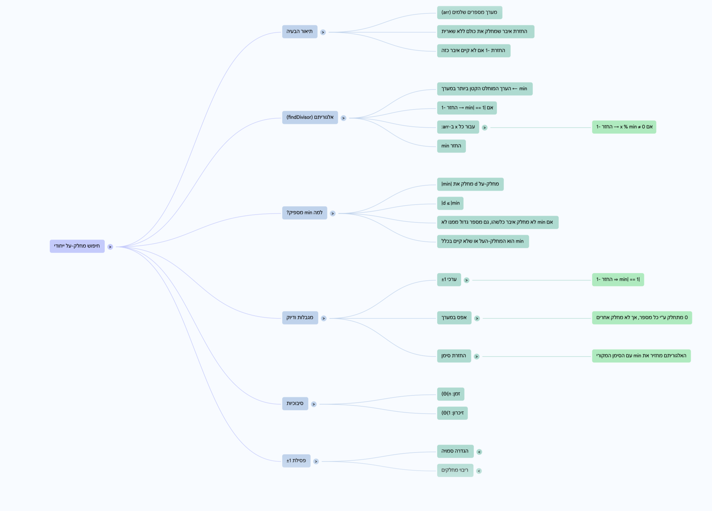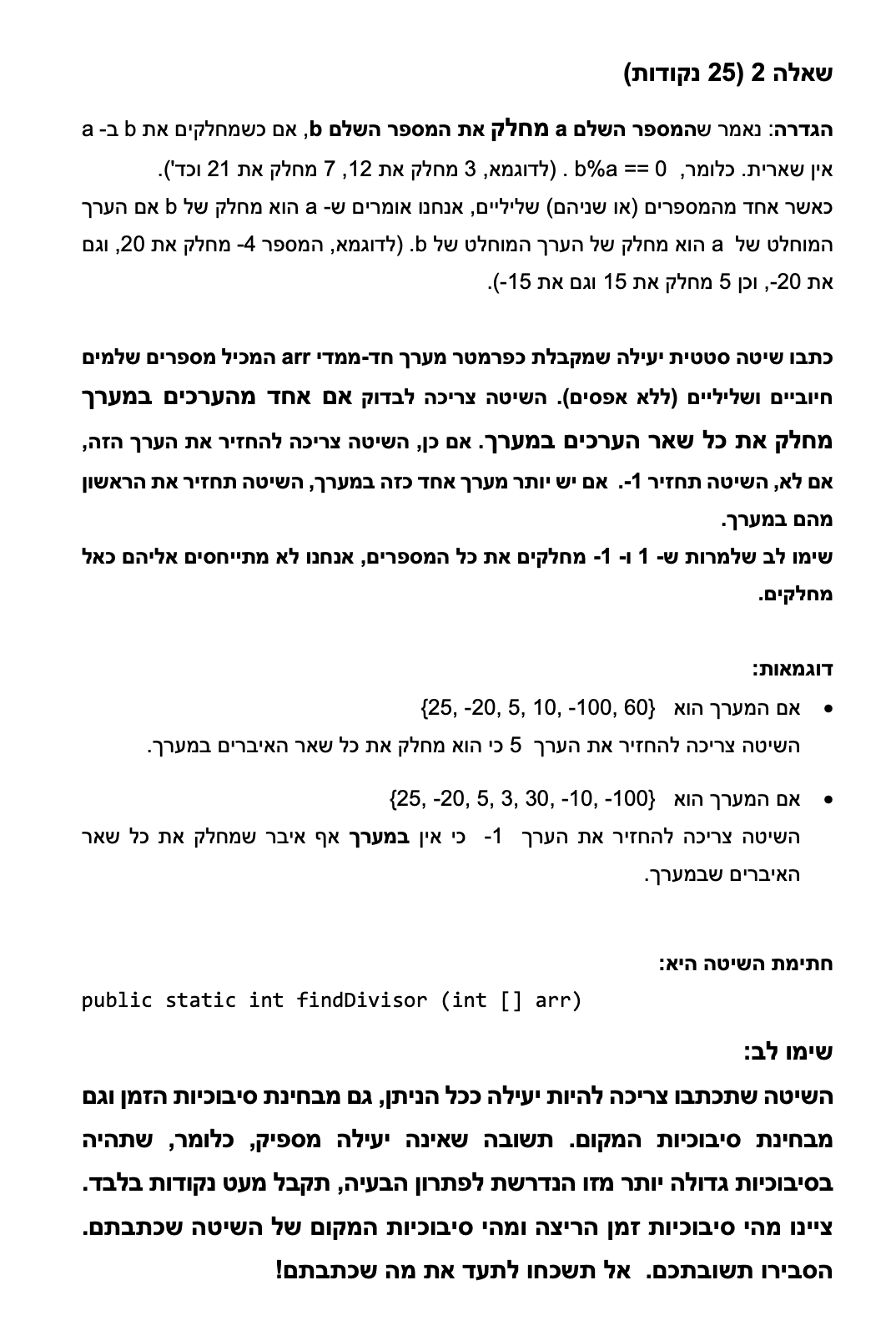 - דמיינו שאתם כותבים תיעוד טכני עבור האלגוריתם findDivisor. הסבירו כיצד יש להשתמש באלגוריתם, מהן המגבלות שלו ומתי הוא עלול להחזיר תוצאה שגויה.