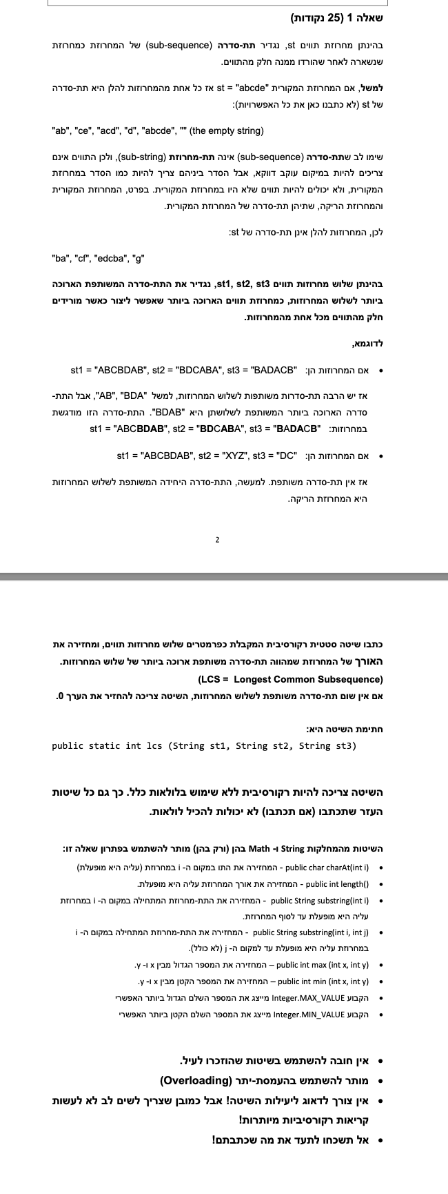 - ניתוח דוגמה ידנית: עבור המחרוזות "ABC", "BAC", "BCA", עקוב אחר הלוגיקה של הפונקציה lcs והסבר כיצד היא מגיעה לאורך ה-LCS. התמקד בהתפצלויות ובבחירות המקסימליות.